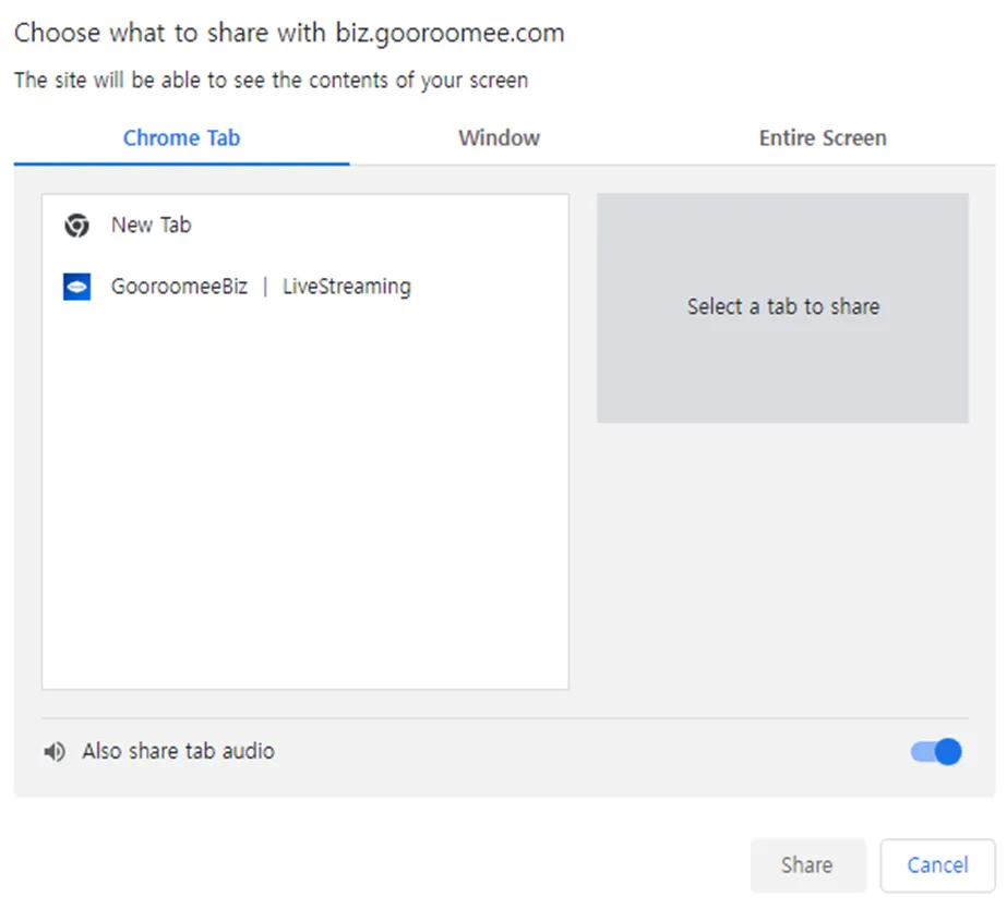 If you wish to share the audio of your screen, use Entire Screen and Chrome/Edge Tab.