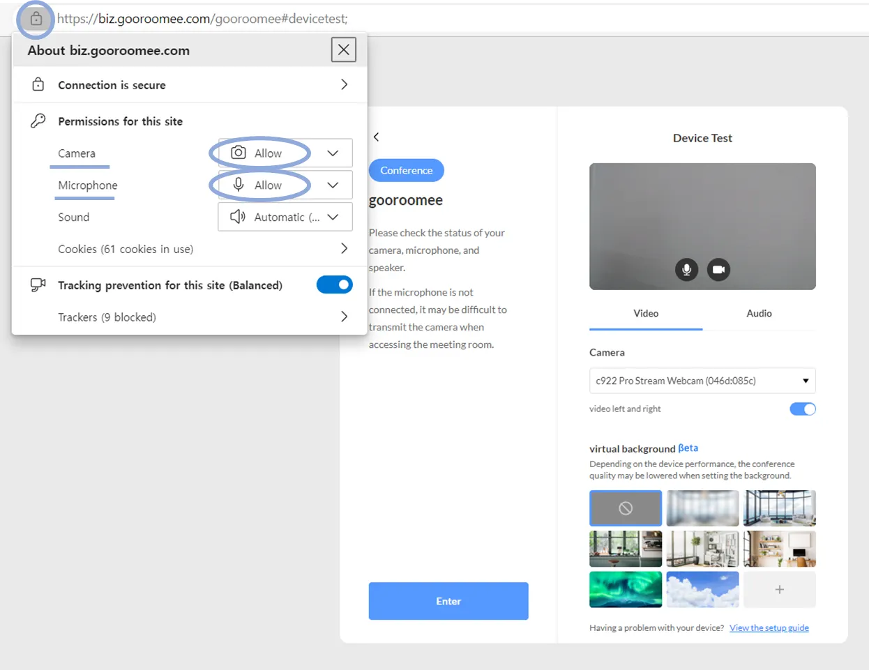 Click on the icon on the device test screen before entrance to check if the camera and microphone permissions are "allowed", then enter.