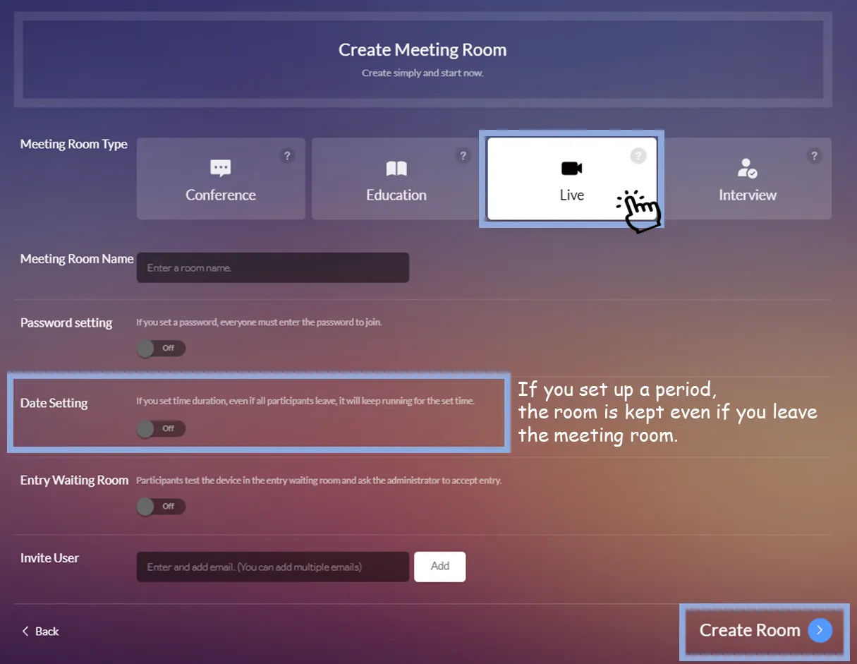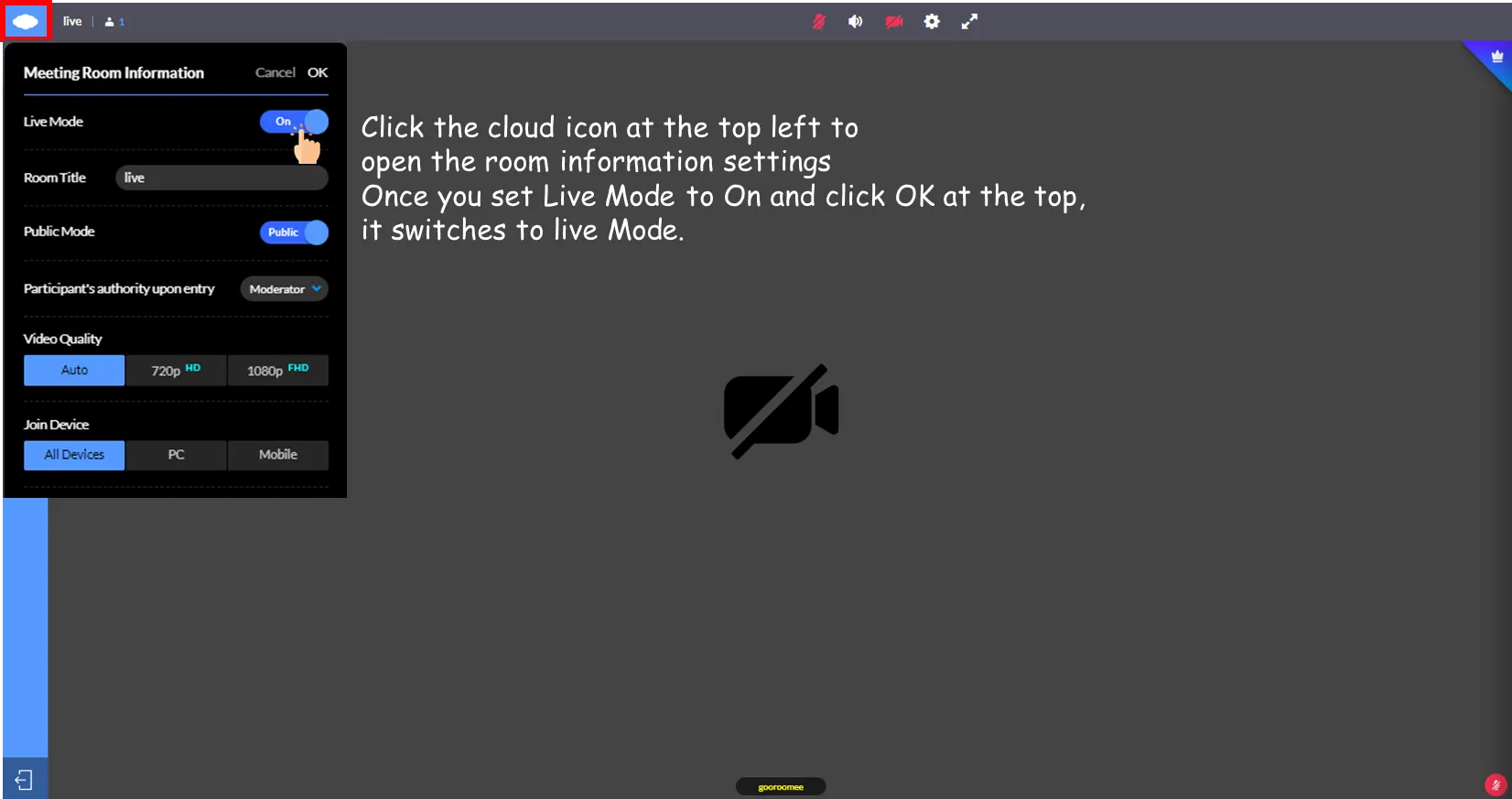 2. Create a room in Conference or Education Mode and then switch to Live Mode