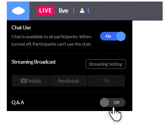 Once you click the cloud icon at the top left in a meeting room to turn the Q&A feature on and click OK, the Q&A feature becomes activated in the menu.
