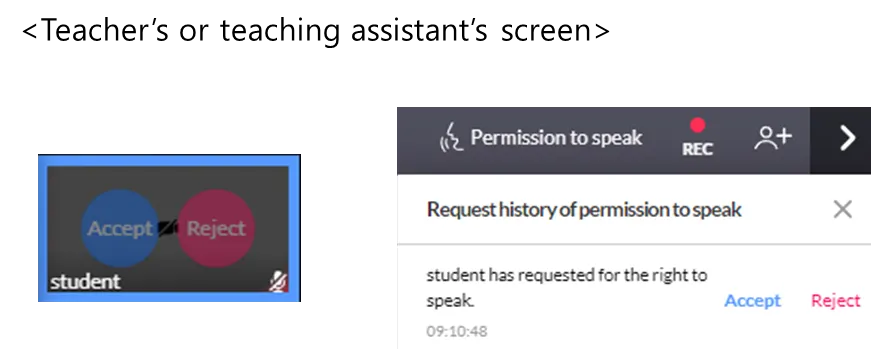 Once a request for the right to speak is received, Accept and Reject buttons appear over the requesting student’s screen and, if the Right to Speak button at the top right is clicked, a list of requests appears.