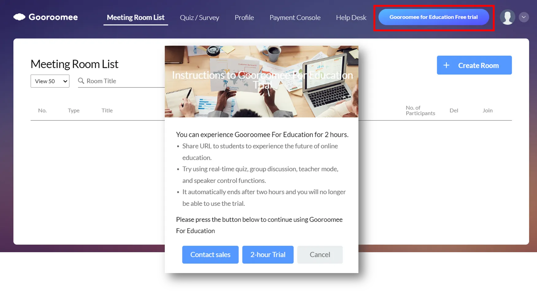 Once you click this button and then click 2-hour Experience, you will be able to use it for 2 hours from the time at which the room is created.